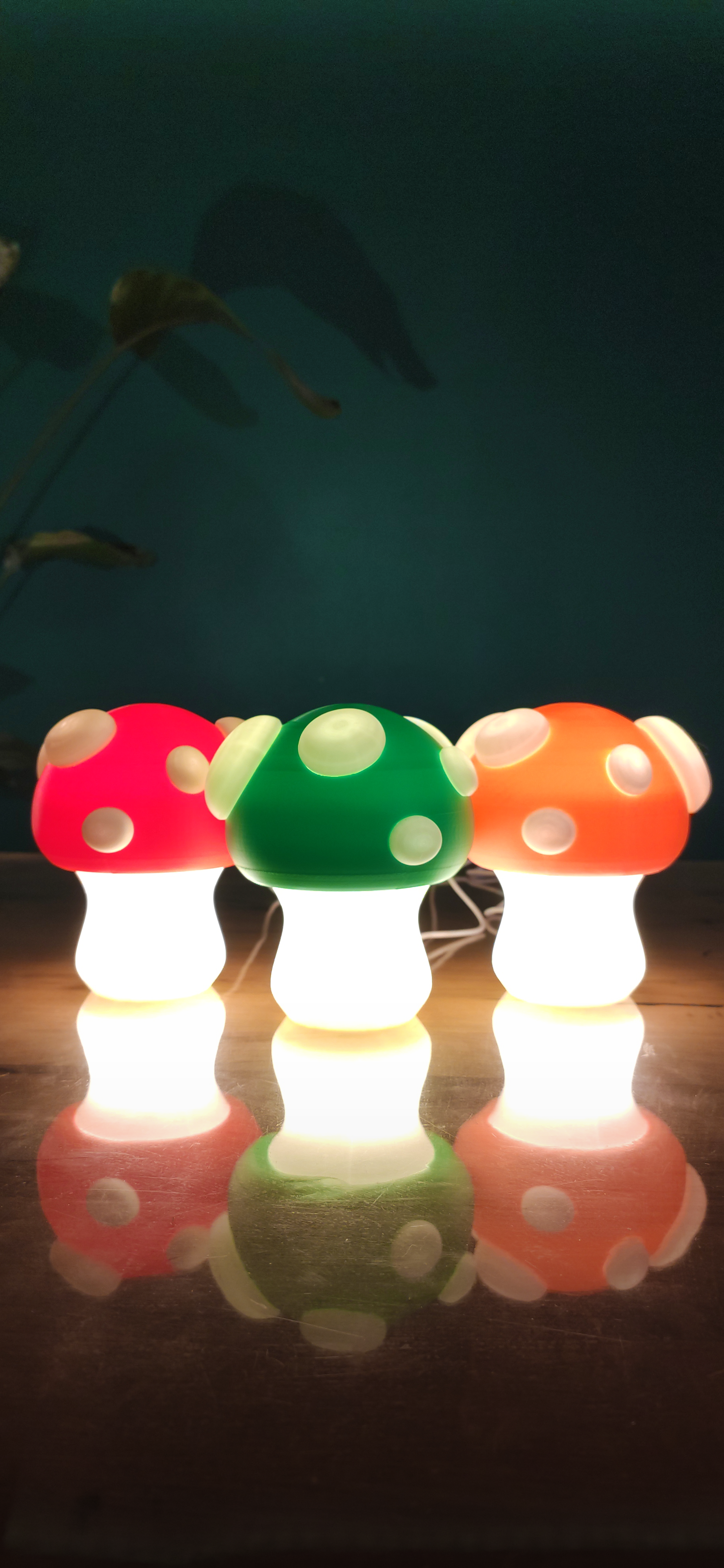 1UP your desk or home with this 3D printed mushroom lamp! Inspired by classic video game icons, this colorful desk light features a vibrant cap (available in red, green, or pink) with white spots and a press-down top to turn it on.